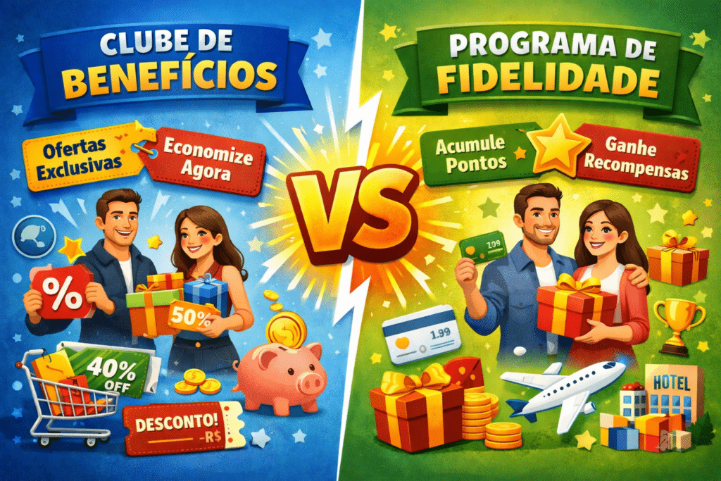 Já o Clube de Benefícios oferece vantagens imediatas, como descontos, experiências exclusivas, parcerias e acesso a ofertas especiais. Em muitos casos, o usuário participa mediante cadastro ou assinatura, sem a necessidade de acumular pontos.
