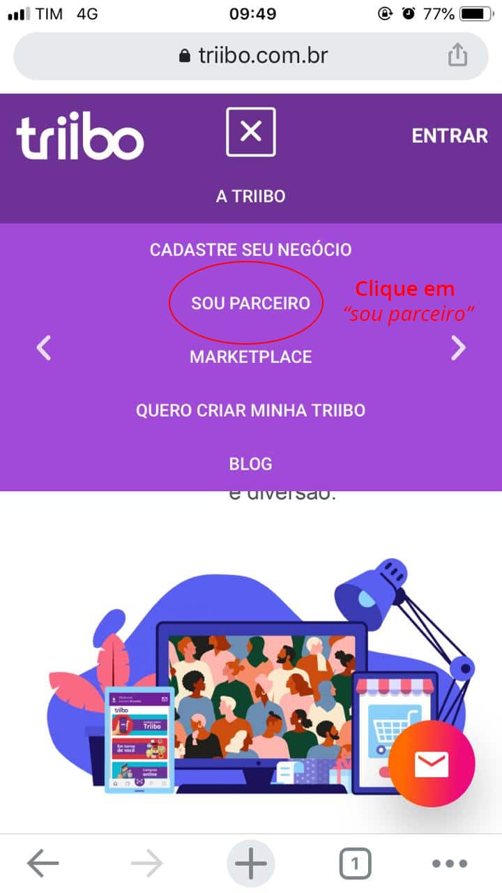 Caso já tenha efetuado a compra do plano e o cadastro, poderá acessar direto pela plataforma pelo botão “Sou Parceiro” dentro do site ou app Triibo.