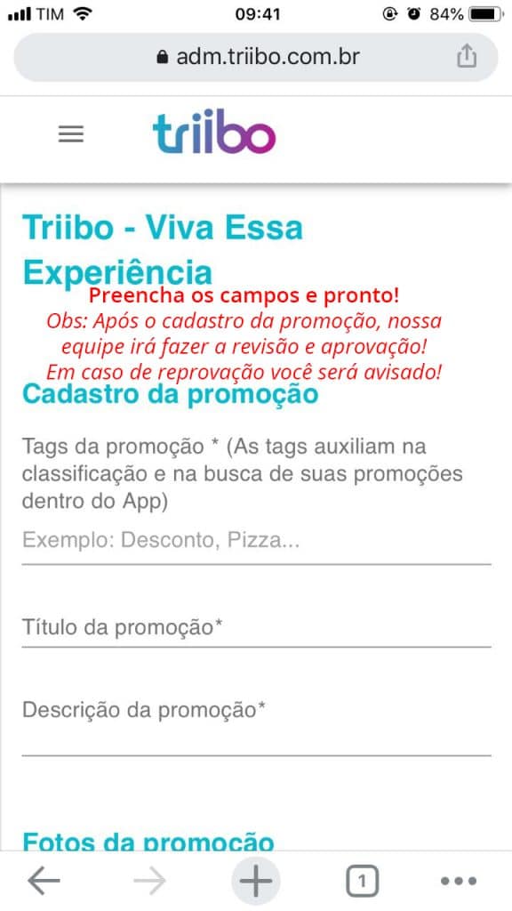 Acessando o site triibo.com.br, no menu superior existe um botão chamado “Cadastre seu negócio”.